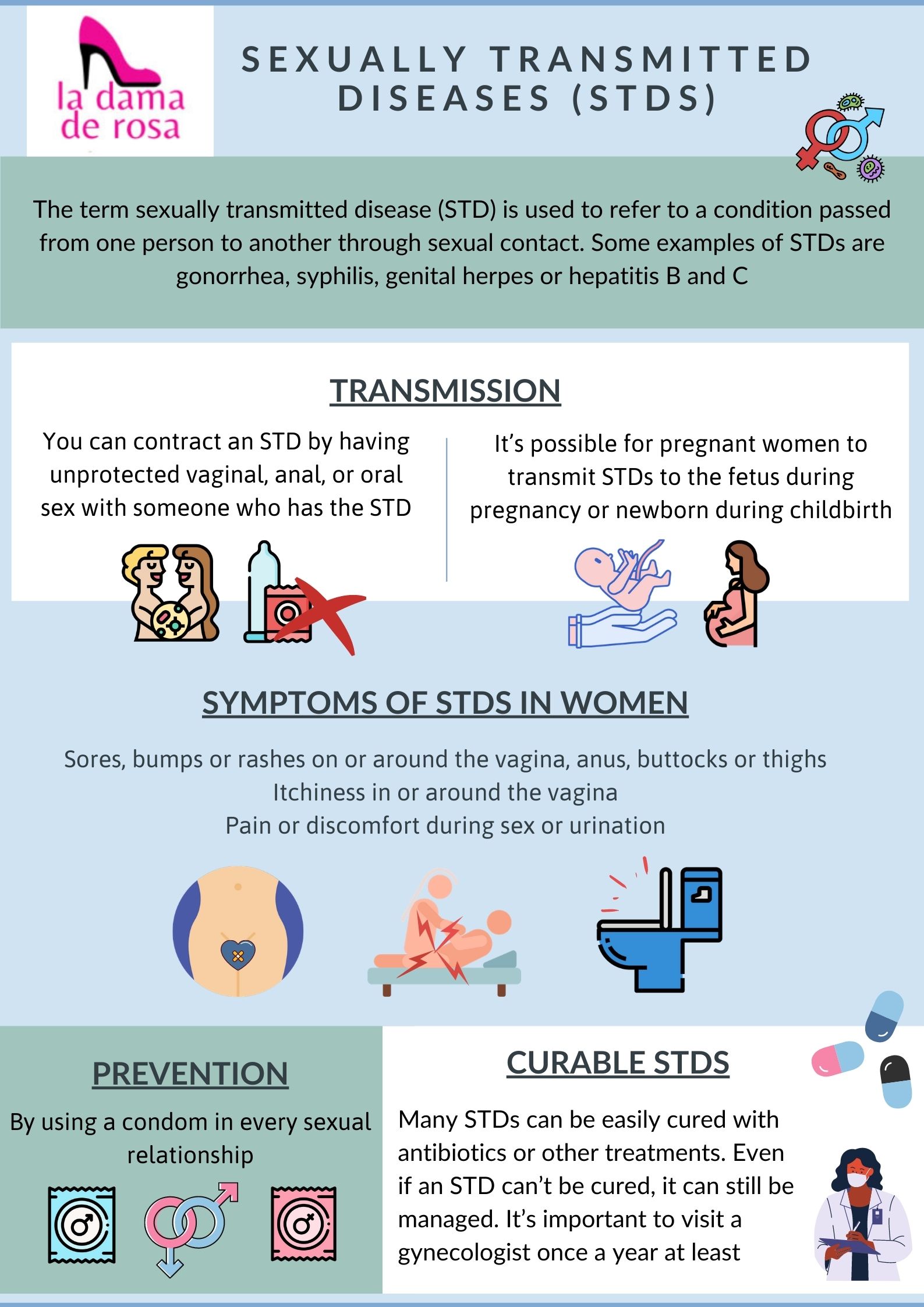 STDs are infections that appear from having SEXUAL CONTACT (vaginal, anal, or oral sex) without using a condom. Some of them are syphilis, gonorrhea, genital herpes or hepatitis B and C. It is VERY IMPORTANT that, even if you have no symptoms, you visit a gynecologist at least once a year. In this brochure we explain what your symptoms could be, how they are transmitted, how they are cured and how they can be prevented.