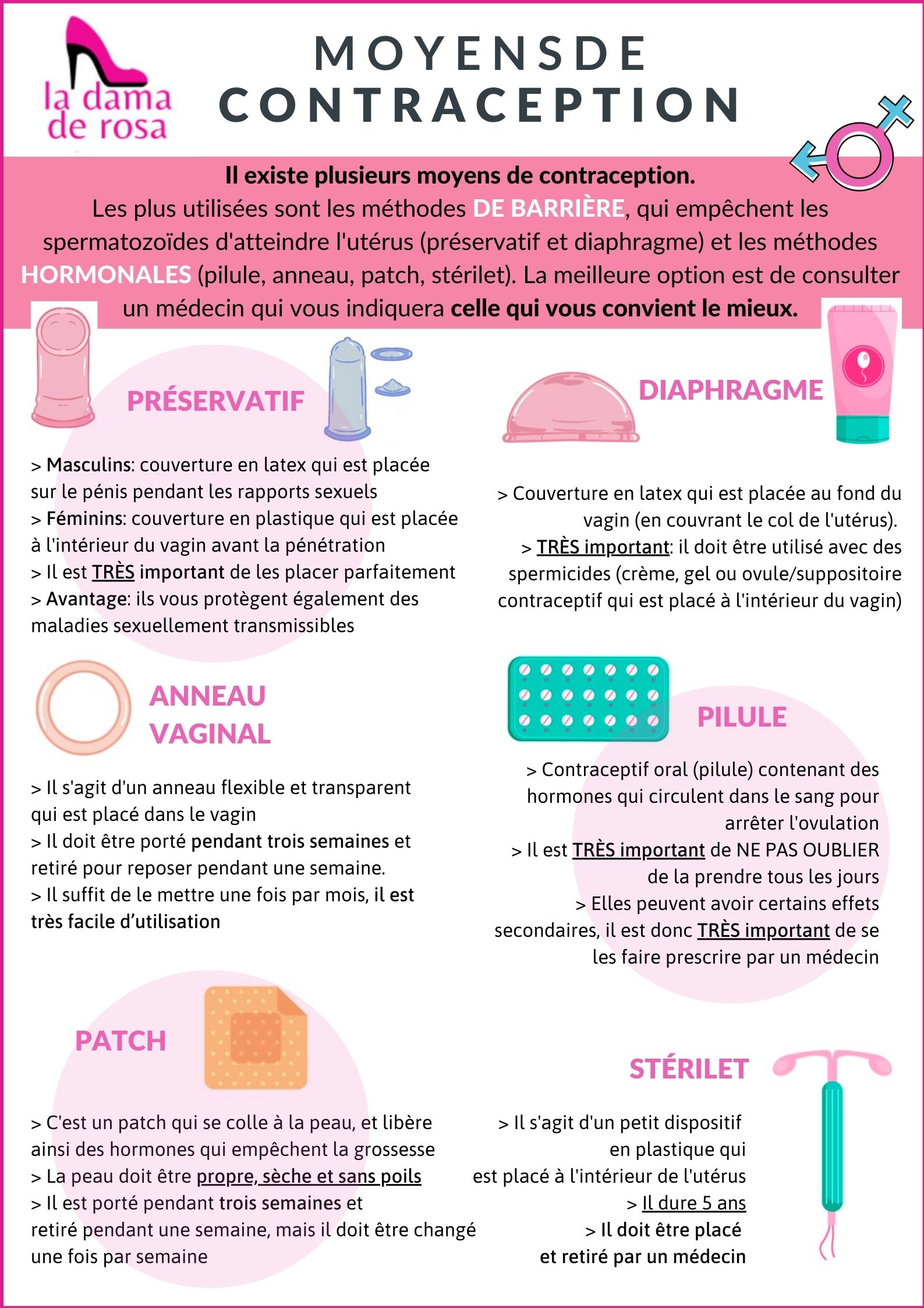 Dans cette brochure, vous trouverez des informations sur les différentes méthodes de contraception existantes. Nous parlons du préservatif, du diaphragme, de l’anneau vaginal, de la pilule contraceptive, du patch et du stérilet. Il est TRÈS important de demander à un médecin quel est le meilleur choix pour vous.