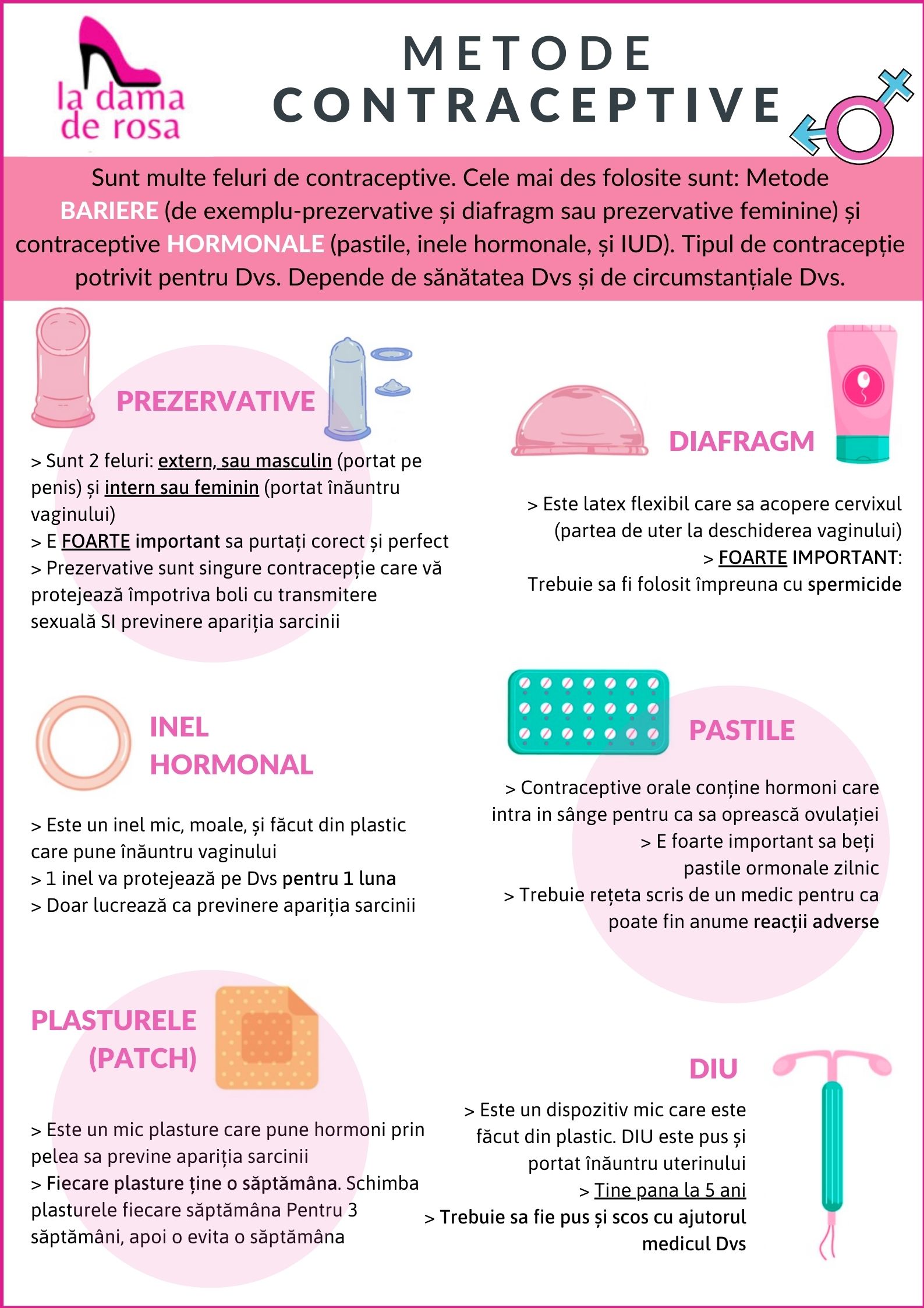 În această broșură puteți găsi informații despre diferitele metode contraceptive disponibile. Vorbim despre prezervative, diafragme, inele vaginale, pilule contraceptive, plasturi și DIU. Este FOARTE important ca medicul dumneavoastră să vă spună care este cel mai potrivit pentru dumneavoastră.