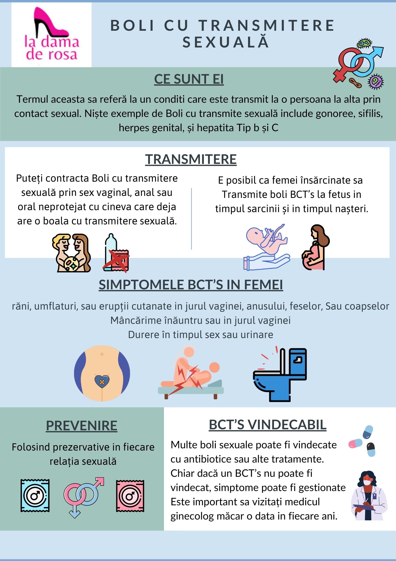 ITS sunt infecții care rezultă din CONTACTUL SEXUAL (sex vaginal, anal sau oral) fără utilizarea prezervativului. Unele dintre acestea sunt sifilis, gonoree, herpes genital sau hepatită B și C. Este FOARTE IMPORTANT că, chiar dacă sunteți asimptomatic, să vă vizitați ginecologul cel puțin o dată pe an pentru un control. În această broșură, vă explicăm care sunt simptomele, cum se răspândesc, cum să le tratați și cum să le preveniți.
